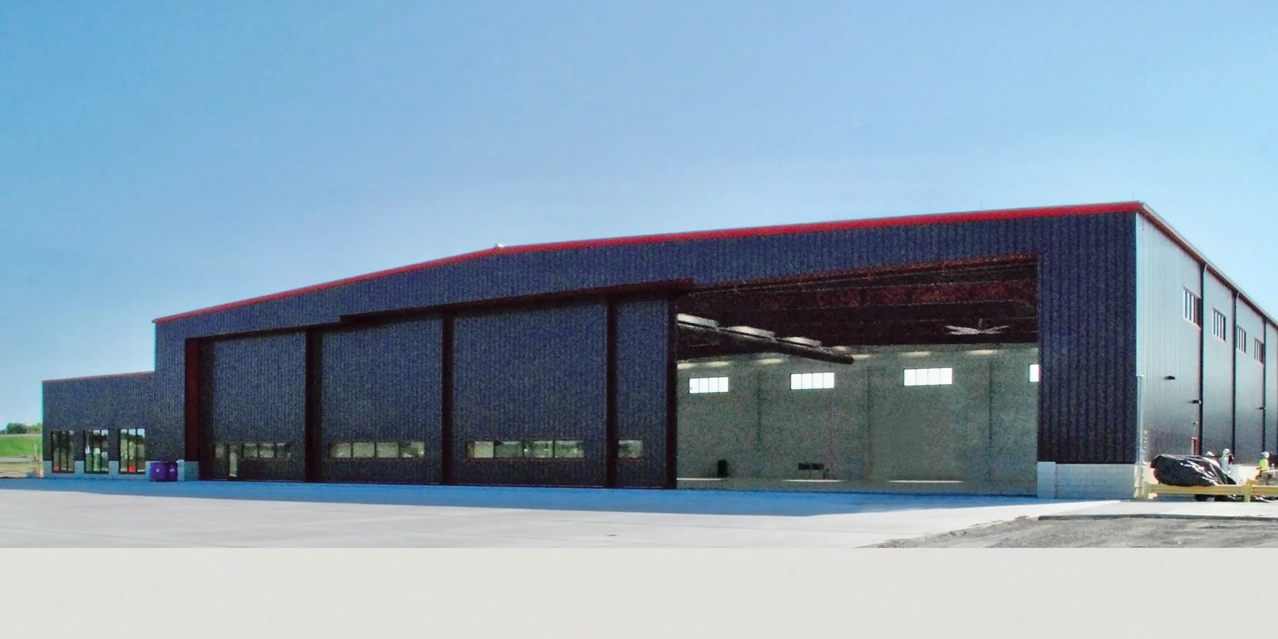 Equipped with Norco hangar doors, the doors operate on railroad tracks embedded in the concrete floor, a unique feature that required precise on-site construction. The door assemblies were constructed on the ground outside the facility and then carefully lifted into place using multiple boom lifts.